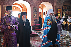The hierarch arrived at the monastery with a pilgrimage group early in the morning and, after being greeted, entered the altar where he vested during the Lenten hours. Archimandrite Roman (Krassovsky), head of the Russian Ecclesiastical Mission in Jerusalem (Russian Orthodox Church Outside of Russia), a cleric of the Mission, Hieromonk Misail (Minin), and ordained pilgrims assisted the Metropolitan.