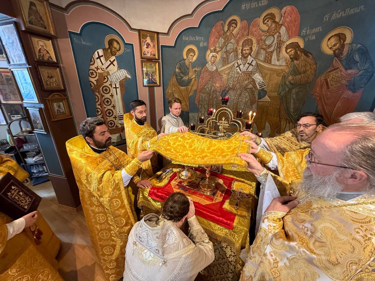 The solemn all-night vigil on the eve of the feast was beautifully performed by the parish choir under the direction of Mother Veronica, after which Bishop Irenei shared a meal with the local clergy, members of the parish council, and other representatives of the parish administration. The next day, after the hierarchical greeting with bread and salt, a solemn Divine Liturgy in honor of the Holy Apostles was celebrated in the magnificent Luxembourg church — a gift to the faithful from the late Archpriest Sergei Poukh and his devoted widow, Matushka Emilia. Within these beautiful walls of the church, the archpastor and clergy led the prayers of the people of God and brought everyone to the holy communion of the Divine Mysteries of Christ.