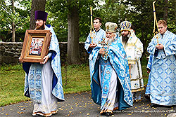 On Thursday, August 28, on the feast of the Dormition of the Most Holy Theotokos, Metropolitan Nicholas arrived at the Dormition Convent "Novo-Diveevo" to celebrate the patronal feast of the monastery with the monastics, clergy, and believers. He brought with him the relics of Saint Tikhon, All-Russian Patriarch-Confessor, for the faithful to venerate. The service began with an akathist to the Dormition of the Theotokos with the small blessing of water; then there was a meeting of the First Hierarch of the Russian Orthodox Church Outside Russia. During the Divine Liturgy at the Seraphim Cathedral, His Grace was joined by the Senior Priest Protopresbyter Alexander Fedorovsky and the monastic clergy.