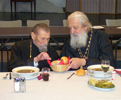 На фото: Высокопреосвященнейший митрополит Лавр с протоиереем Георгием Беляем на трапезе во время пастырского совещания Канадской епархии в г. Торонто. |