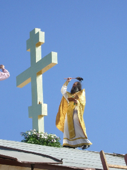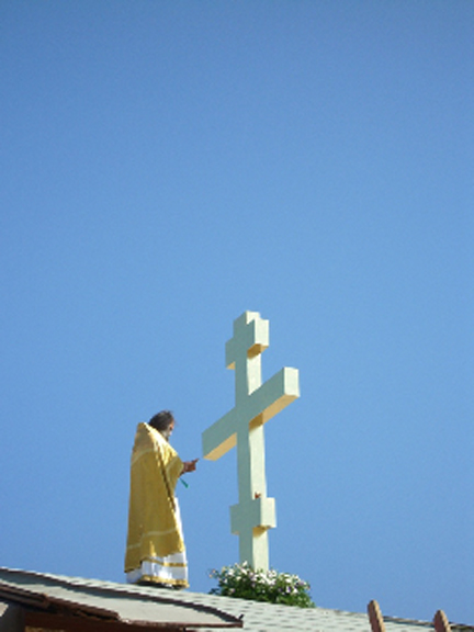 Отец Николай взбирается по отвесной лестнице к самому кресту. Сестры и все верующие остаются внизу. Освящение длилось почти час. После него всем желающим предложили подняться ко кресту, но лишь немногие откликнулись, хотя хотели все присутствовавшие. Подъем довольно опасный. Мы переживали – сможет ли отец Николай в полном облачении спуститься. Но, слава Богу, все прошло благополучно. После освящения креста, все пришли в храм на литургию, которая была для нас необычно поздней (в 9:30) . В храме прекрасная акустика. В нем легко петь. А святость места наполняет душу благоговением. Для будничного дня собралось довольно много верующих и почти все причащались. После литургии служащими храма была предложена праздничная трапеза для клира и монашествующих. Благодарим Бога за великую Его милость.
