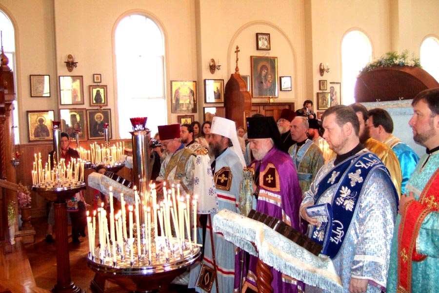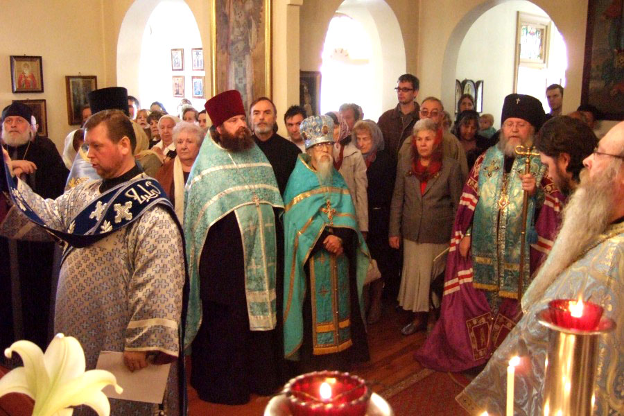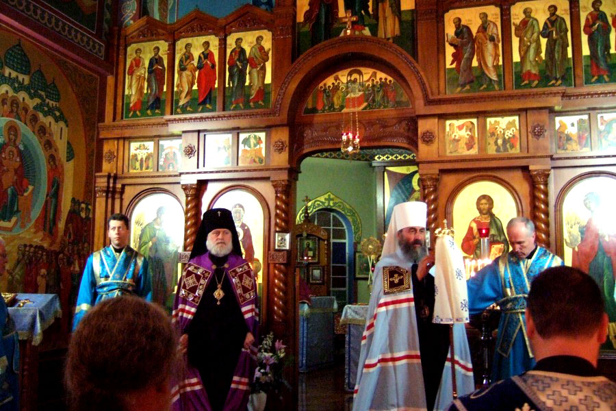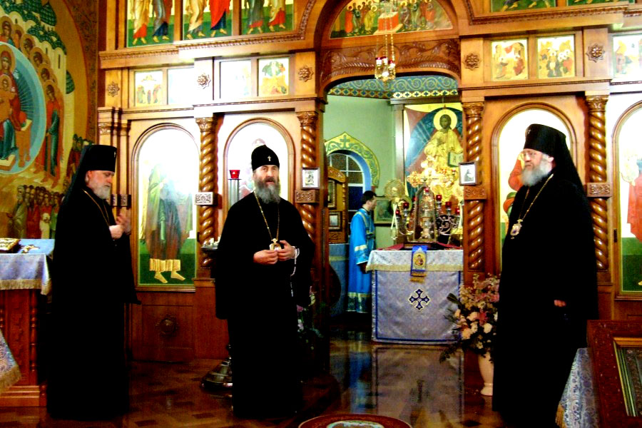 Митрополит Онуфрий, Архиепископ Евгений, их сопроводитель Протоиерей Михаил Бойков и др. вошли во храм всед за иконой. Это первый раз в истории Архиереской Крестовой церкви, когда ни только один, а сразу два архиерея РПЦ МП вошли в храм, чтобы вознести Богу и Его Пречистой Матери совместную молитву с духовенством и народом РПЦЗ.