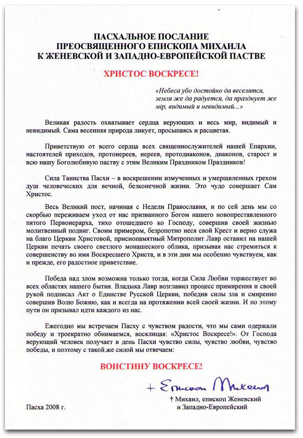 Пасхальное послание епископа Женевского и Западно-Европейского Михаила