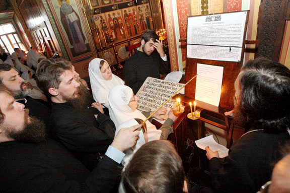 После окончания молебна и окропления верующих святой водой началось чтение похвального слова священномученика Климента Римского, положенное на этот день.