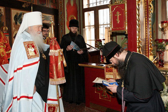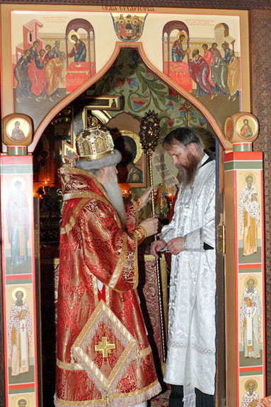 Я с душевным трепетом переступаю порог этого святого храма, для совершения в нем молитвы в престольный праздник и в день, когда мы вспоминаем 320-летие основания этого благолепного храма и 20-летие его возрождения после осквернения и опустошения. Мы с благодарностью Господу взираем на усердные труды, которые в течение двадцати лет совершаете Вы под руководством своего благочестивейшего настоятеля отца Иринарха. Мне очень трогательны слова Александра Гелиевича, с которыми он обратился ко мне и от Вашего имени преподнес образ Матери Божией „Неопалимая Купина“. В моей домовой церкви это будет постоянное напоминание о ваших трудах и о моем долге попечения о вас. Мы в начале нашей молитвы как бы обмениваемся дарами любви. Для меня сегодня огромная радость, что с нами сегодня будет молиться и совершать Божественную литургию Преосвященный епископ Иоанн. Русская Зарубежная Церковь, к которой он принадлежит, прошла тяжелый путь испытаний. И мы счастливы, что Господь дал нам радость пребывать теперь в молитвенном общении. Мы молимся и о блаженно почившем Святейшем Патриархе Алексии (скоро исполнится год со дня его блаженной кончины), и о Владыке митрополите Лавре, которые стали символом единства нашей Святой Русской Православной Церкви. Я хотел бы, возлюбленный Владыка Иоанн, от имени общины и духовенства единоверческой церкви Михаила Архангела преподнести Вам эту святую митру, чтобы Вы сегодня в ней приняли участие в богослужении, и она всегда напоминала Вам о нашей совместной молитве».