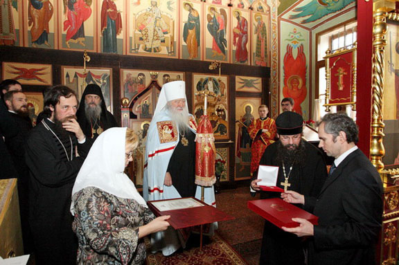 Там же Высокопреосвященнейшего Ювеналия ожидала и депутация представителей Михаило-Архангельской общины, вручившая ему икону Пресвятой Богородицы «Неопалимая Купина». При передаче дара клирошанин храма Александр Гелиевич Дугин зачитал Владыке благодарственный адрес следующего содержания: