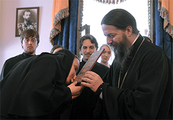 Епископ Феодосий вручил настоятельнице Марфо-Мариинской обители инокине Екатерине (Поздняковой) святой образ Матери Божией "Курская-Коренная" - Покровительницы русского зарубежья.