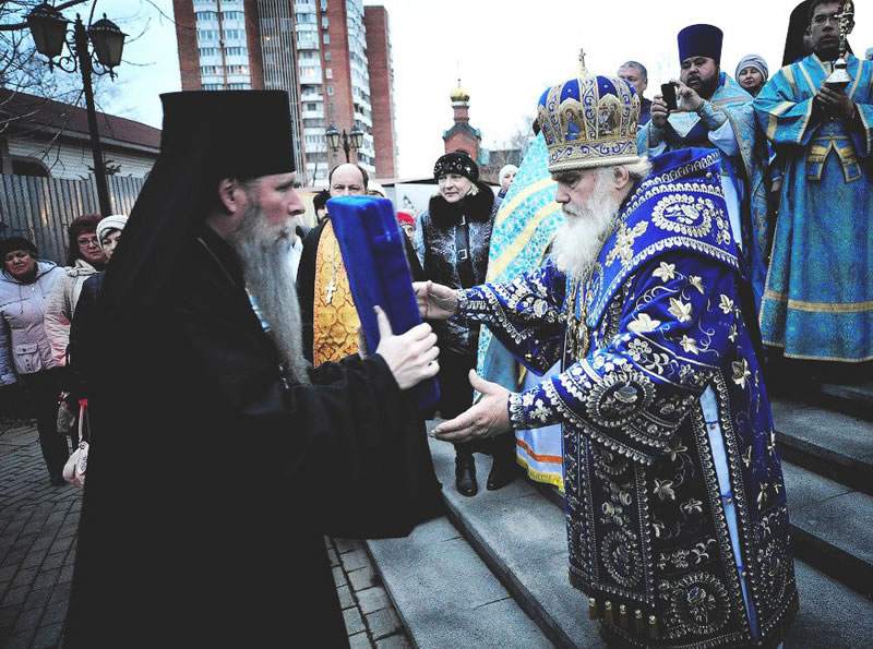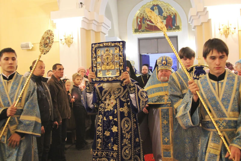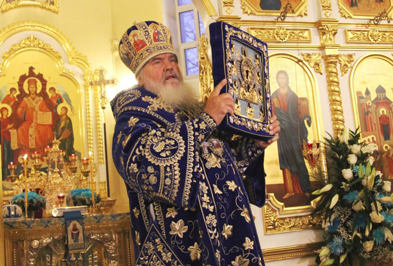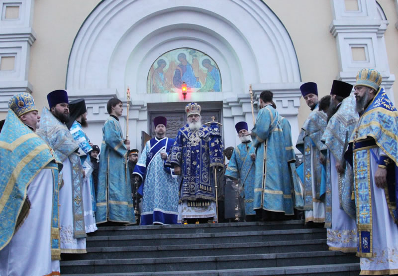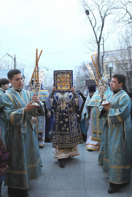 Богослужение началось с торжественного принесения в Покровский кафедральный собор древнего образа – Курской-Коренной иконы Божией Матери «Знамение». Перед образом митрополит Владивостокский и Приморский Вениамин возглавил соборный молебен, а затем состоялось служение Божественной литургии.