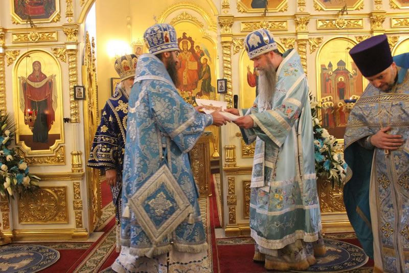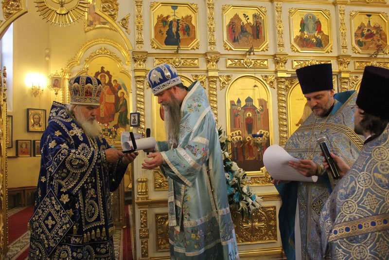 Далее архиепископ Кирилл вручил Синодальную грамоту епископу Иннокентию, викарию Владивостокской епархии во внимание к усердным трудам на благо Церкви и в связи с днём рождения.