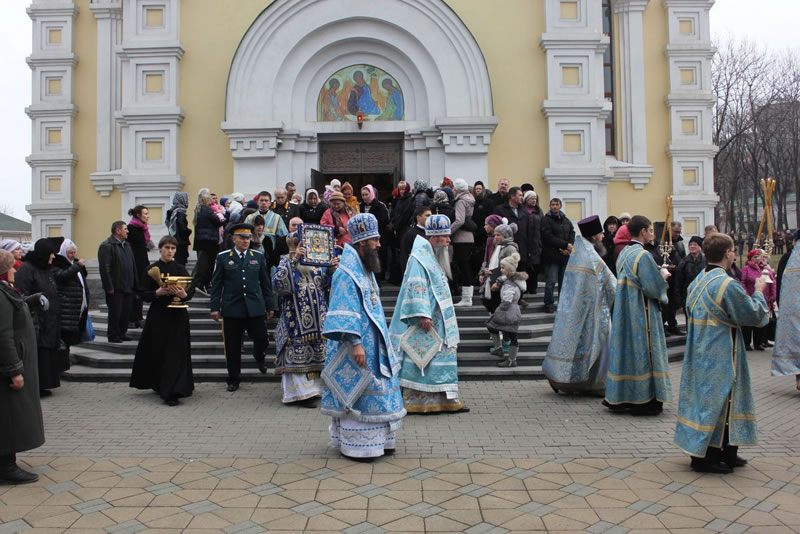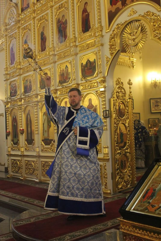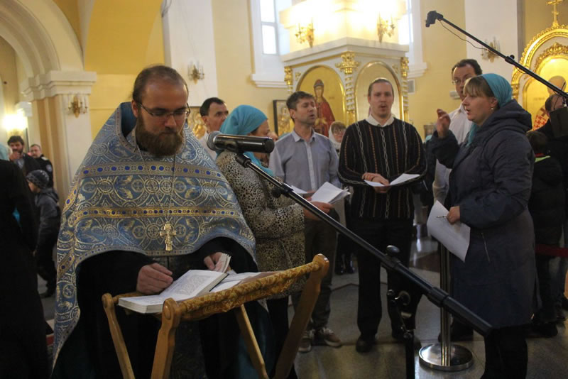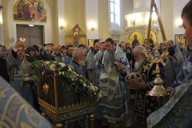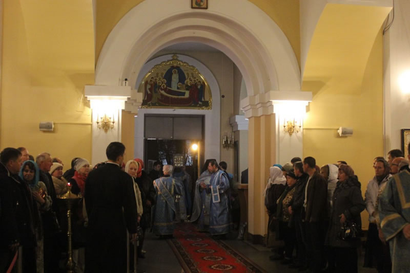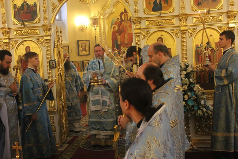 После Божественной литургии в Покровском соборе до самого вечера, до закрытия собора, служили молебны Божией Матери.
