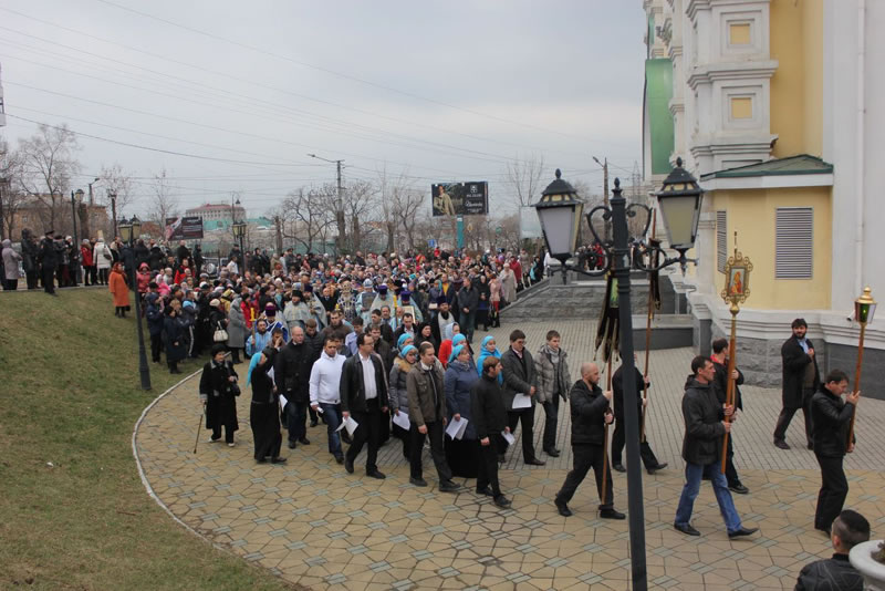 Сотни приморцев пришли в это утро помолиться перед древней святыней – Курской-Коренной иконой Божией Матери "Знамение". Завершилась Божественная литургия крестным ходом с чудотворной иконой Божией Матери вокруг Покровского кафедрального собора.