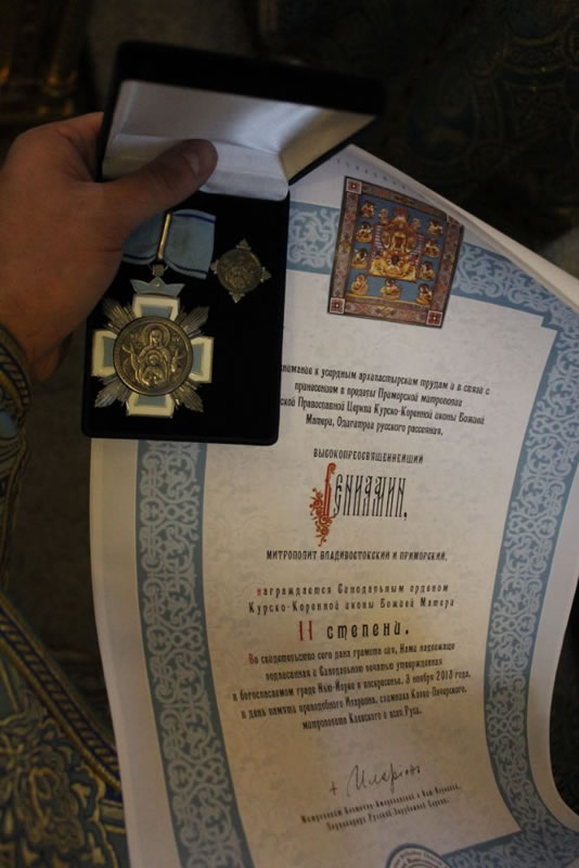 - Мы рады быть в России, быть со своим народом, – сказал архиепископ Кирилл и зачитал грамоту: "По постановлению Святейшего Синода Русской Православной Церкви Заграницей во внимание к усердным трудам и в связи с 75-летим со дня рождения и с принесением в пределы Приморской митрополии Курской Коренной иконы Божией Матери "Знамение" – Одигитрии (путеводительницы) русского рассеяния Высокопреосвященнейший владыка Вениамин, митрополит Владивостокский и Приморский награждается синодальным орденом Курской Коренной иконы Божией Матери II степени. Во свидетельство сего дана грамота сия, нами надлежаще подписанная и Синодальною печатью утверждённая в Богоспасаемом граде Нью-Йорке в воскресенье, 3 ноября 2013 года, в день памяти преподобного Иллариона, схимника Киево-Печерского, митрополита Киевского и всея Руси".