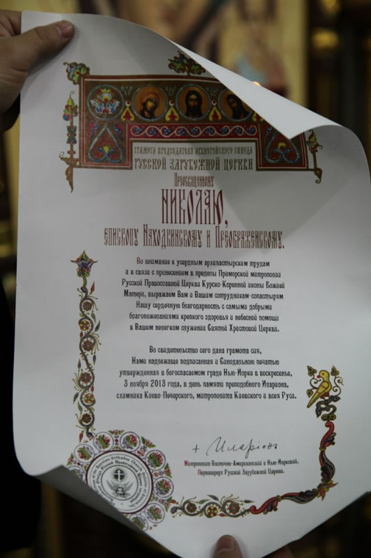 По окончании торжественного славления епископ Николай обратился к архиепископу Сан-Францисскому и Западно-Американскому Кириллу и духовенству Русской Зарубежной Церкви с архиерейским словом, в ответном слове архиепископ Кирилл, поблагодарил епископа Николая за теплый и радушный прием и преподнес владыке Николаю, в дар, икону Божией Матери «Утоли моя печали» и список с образа Курской-Коренной иконы Божией Матери "Знамение", от Синода Русской Зарубежной Церкви, во внимание к понесенным архипастырским трудам, епископу Николаю была вручена благодарственная грамота.