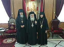 В понедельник, 7 августа, Блаженнейший Патриарх Святаго града Иерусалима и всея Палестины Феофил III принял архимандрита Романа (Красовского), Начальника Духовной Миссии Русской Зарубежной Церкви в Иерусалиме, и монахиню Варвару (Новикову), в июне с.г. назначенную Архиерейским Собором и.о. настоятельницы Спасо-Вознесенской женской обители на Елеоне. Отечески напутствовав монахиню Варвару во время продолжительной беседы, Его Блаженство преподал ей свое Первосвятительское благословение на новое служение и вручил ей наперсный крест.