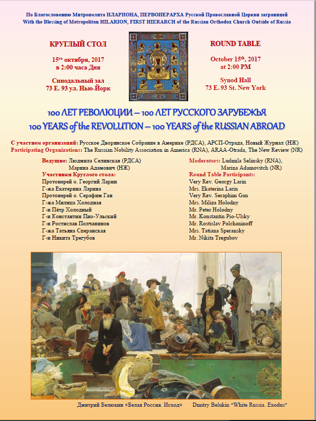 В воскресенье, 15 октября, по благословению митрополита Восточно-Американского и Нью-Йоркского Илариона и инициативе церковно-общественных деятелей большого Нью-Йорка, в трапезной Синодальной резиденции на Манхэттене состоится круглый стол, посвященный теме 100-летия революции и русского рассеяния, с участием духовенства и мирян Русской Зарубежной Церкви. Начало в 2 часа дня.