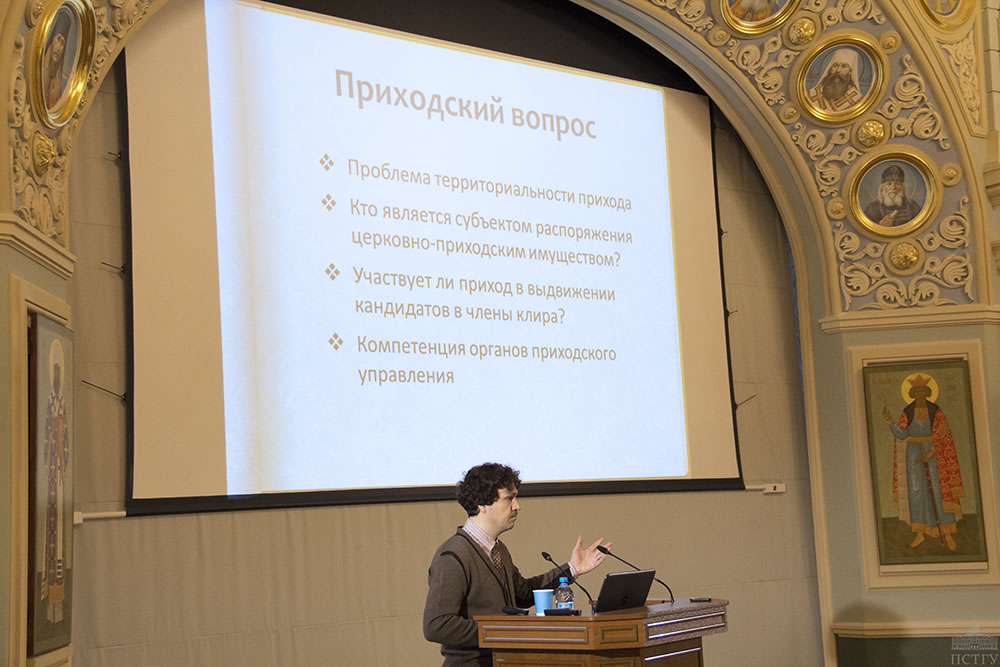 Доклад А. Л. Беглова (ИВИ РАН) «Труды Священного Собора 1917-1918 гг. в области реформы православного прихода» был посвящен обсуждению на Соборе основных вопросов приходской жизни: отношение к храму, причту, прихожанам и приходскому имуществу. Введение к Приходскому Уставу стало единственным документом Собора, имевшим догматическое содержание, в котором разрабатывалось сотериологическое учение о спасении души в приходской жизни.