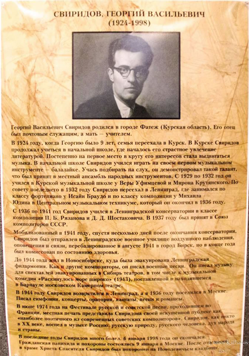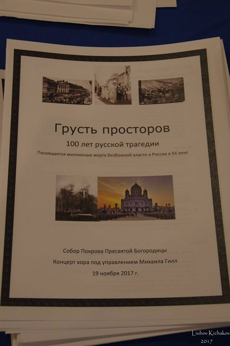 После литургии в церковном зале состоялся концерт хора п/у Михаила Гилл. Лейтмотивом и названием концерта «Грусть просторов» послужило стихотворение Федора Сологуба, написанное им в 1903 году, как будто в предчувствии грядущих потрясений. Музыку на эти слова композитор Георгий Свиридов написал в 70-х годах XX века, когда предчувствие сбылось в полной мере, и, казалось, что не будет просвета у этой грусти.