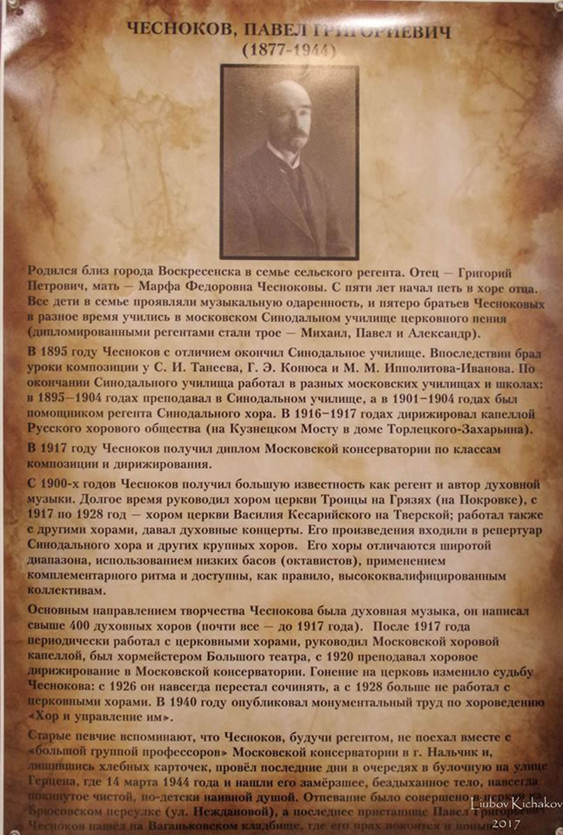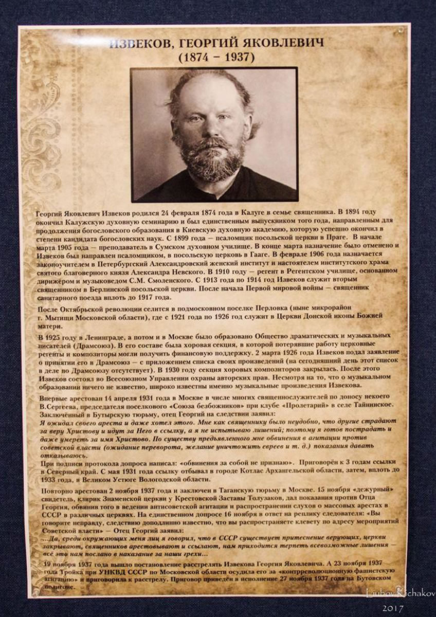 Репертуар был выбран исключительно из произведений композиторов ХХ века – Г. Свиридова, К. Шведова, Г. Лапаева, П. Чеснокова и священномученика иерея Георгия Извекова, расстрелянного на Бутовском полигоне в 1937 году. При помощи музыки и проецируемых на экран фотографий перед зрителями прошел весь скорбный путь России от трагических событий 1917 года до наших дней. Песнопения концерта были выстроены в хронологической последовательности, отразившей духовную историю нашей Родины. У истоков трагедии лежала гордыня богоборчества, которой страдали многие представители образованных классов в начале ХХ века, включая и поэта Федора Сологуба. Революция, братоубийственная гражданская война, репрессии, смерть миллионов, исход в эмиграцию, церковные разделения и нестроения, новые войны и миллионы жертв. Но все же, через десятилетия кровь новомучеников дала покаянные всходы. Через 10 лет после их прославления иго безбожной власти пало и Церковь в России обрела полную свободу, а Россия воскресла к новой жизни. Программа закончилась пением «Вечной памяти» всем безвинным жертвам безбожной власти и Величания Новомученикам и Исповедникам Российским. Специально к концерту была устроена выставка экспонатов и плакатов с жизнеописаниями поэтов, композиторов и простых людей, которые пострадали в те страшные годы, послужив примерами христианской и творческой жизни.