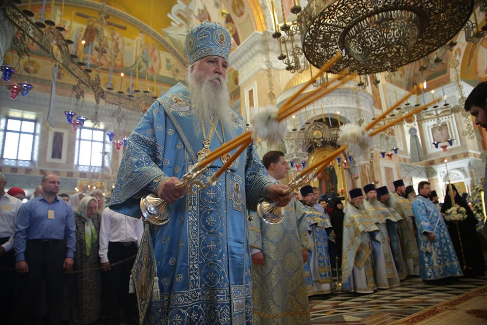По завершению праздничного богослужения архипастыри возглавили традиционный крестный ход вокруг Александро-Невского собора с главной иконой – Тихвинским образом Богоматери.