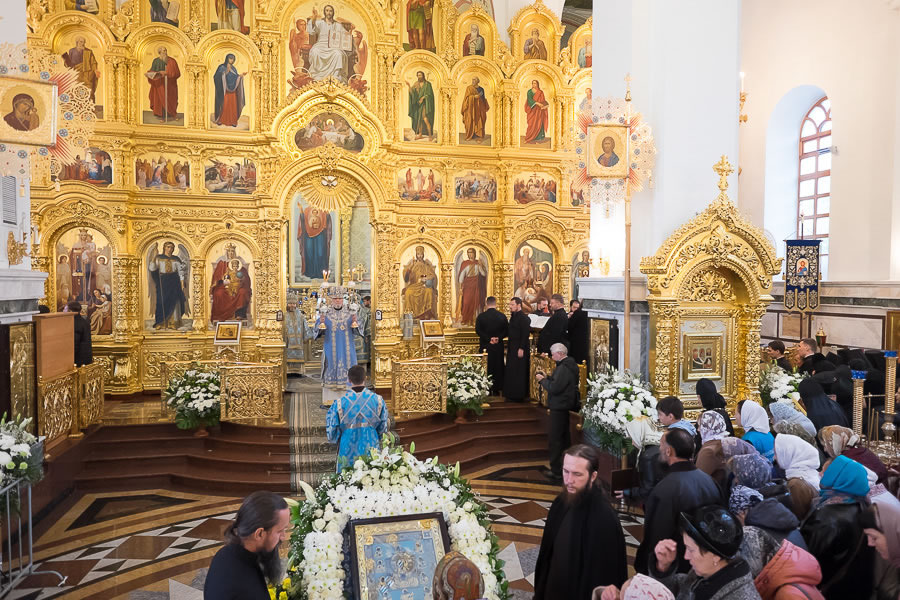 Глава Курской митрополии благословил Курск и его жителей святым образом Покровительницы и Заступницы края, и под молитвенное пение святыню внесли в Знаменский кафедральный собор, установив на аналой в центре храма. Священство, а затем все желающие смогли поклониться чудотворному образу.