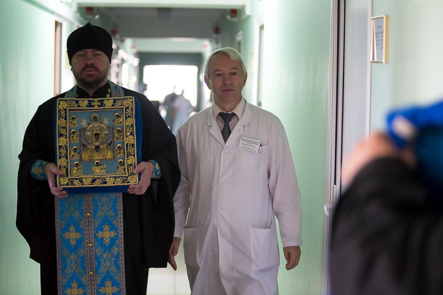 Завершилось посещение лечебных учреждений в Курской областной клинической больнице, где чудотворный образ был принесен пациентам реанимации.