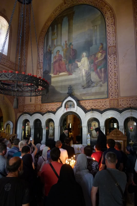 Затем Блаженнейший владыка Онуфрий направился в русский Спасо-Вознесенский женский монастырь на Елеоне. Здесь под звон доброшумных колоколов «Русской свечи» Его Блаженство был встречен духовенством и игуменией Варварой (Новиковой) с сестрами, а потом проследовал в соборный храм, где благоговейно почтил престол, святыни и место упокоения самого великого из миссийских начальников архимандрита Антонина (Капустина). В часовне, освященной в честь Предтечи Господня Иоанна была совершена исповедь паломников, сопровождавших Его Блаженство, а в монастырском саду среди оливковых деревьев было прочитано правило ко Святому Причащению. По окончании последования Его Блаженство, выразив благодарность за возможность поклонения святыням обители, вместе с епископом Шепетовским и Славутским Евсевием и паломниками направился на Гроб Господень для служения ночной Божественной литургии.