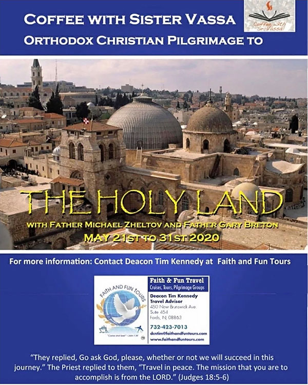 По благословению Первоиерарха Русской Зарубежной Церкви с 21 по 31 мая с.г. состоится паломничество на Святую Землю, устраиваемое инокиней Вассой (Лариной). В паломничестве примут участие член Межсоборного Присутствия протоиерей Михаил Желтов и клирик Православной Церкви в Америке священник Гэри Бритон. За дополнительной информацией см.: coffeewithsistervassa.com/pilgrimage