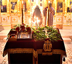 В преполовение Великого поста, для укрепления и утешения верующих, богослужебным уставом Православной Церкви полагается износить Животворящий Крест Господень на середину храма для поклонения и благоговейного целования.
