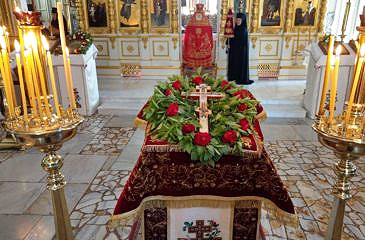 По уставу этого праздника, после Великого славословия во время пения Трисвятого, Крест был торжествено вынесен на середину храма. Затем, был совершен «чин Воздвижения Креста». Предстоятельствовавший осенил молившихся Крестом на все стороны, при провозглашении особых прошений диаконом. Хор отвечал на каждое прошение пением молитвы «Господи помилуй» стократно. В то время, когда предстоятель медленно в поклоне опускает крест «долу», духовенство поливает Крест водой. Стекающая по Кресту вода, благоговейно собирается сестрами на приготовленный поднос с разложенными на нем ветвями базилика и цветов. Освященные таким образом, ветви затем раздавали сестрам в благословение после поклонения Кресту. Чин совершается в воспоминание обретения Животворящего Древа Креста Господня царицей Еленой и воздвижение его патриархом Иерусалимским Макарием, при котором народ восклицал «Господи помилуй!»