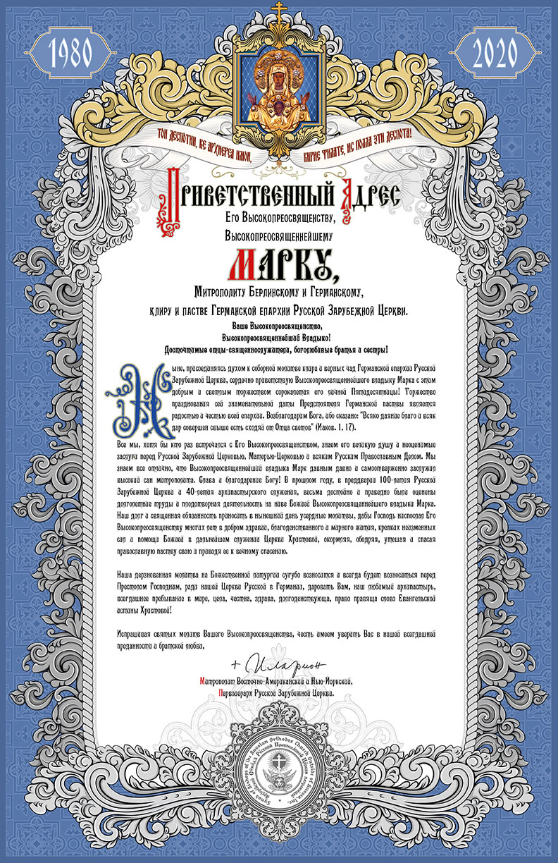 Приветственный адрес Первоиерарха Русской Зарубежной Церкви митрополиту Берлинскому и Германскому Марку по случаю сорокалетия архиерейской хиротонии