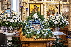 В связи с пандемией коронавируса, участие духовенства и мирян в богослужениях было ограничено. Однако, несмотря на будний день и соблюдая правила карантина, верующие молились перед чудотворным образом Одигитрии Русского Рассеяния и причастились Святых Христовых Таин.