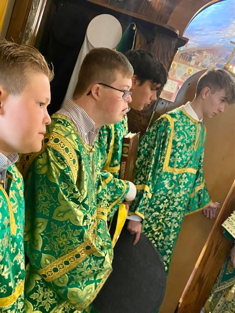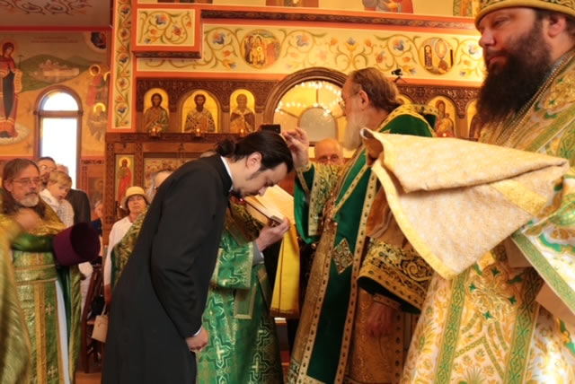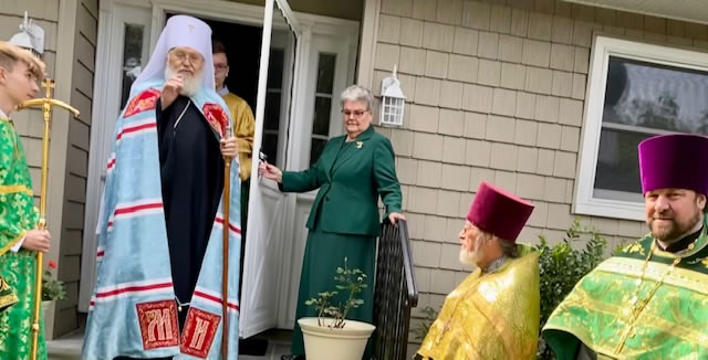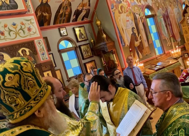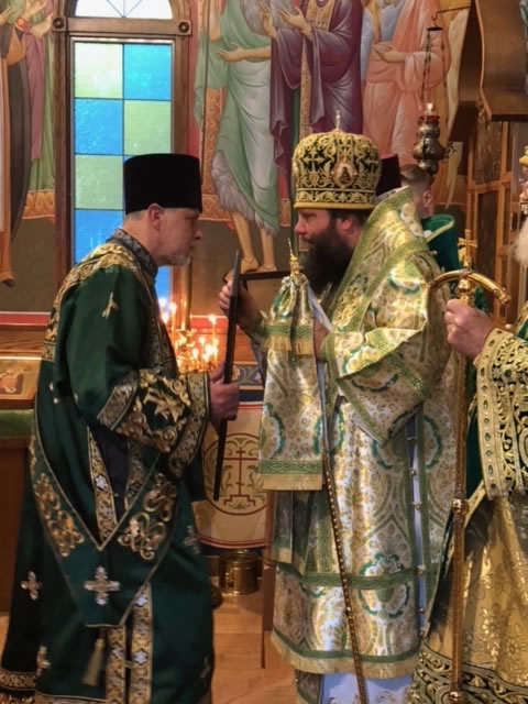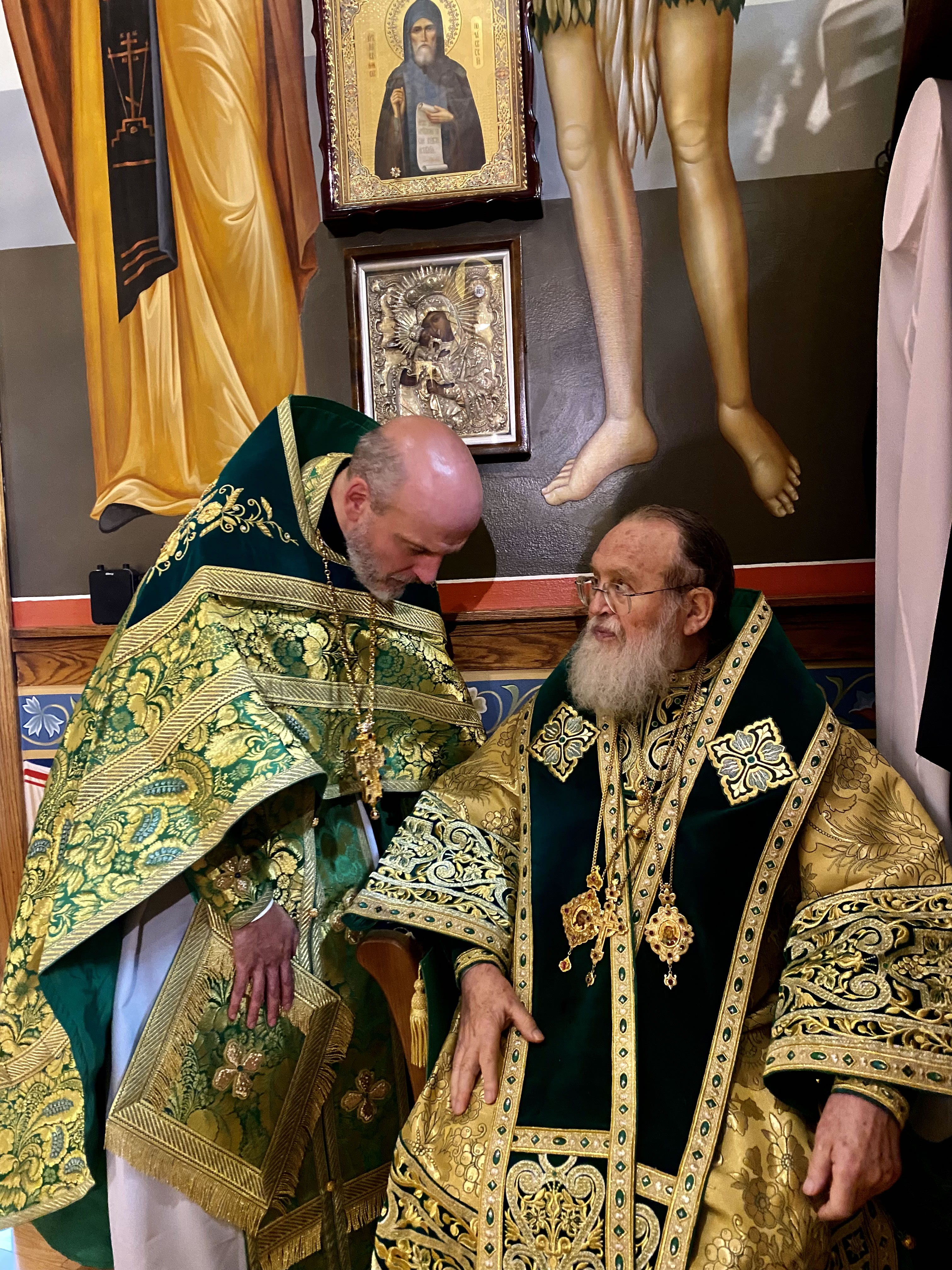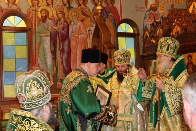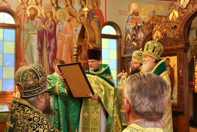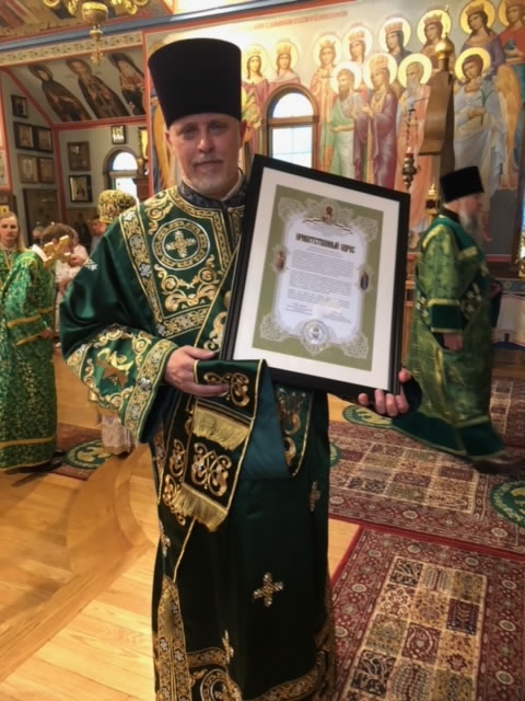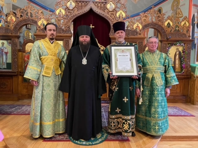 В своем слове на праздничном приеме настоятель храма поздравил Его Высокопреосвященство с 45-летием пресвитерской хиротонии, а Преосвященного владыку Николая – с 15-летием священнослужения, вручив им памятные дары. "45 лет тому назад, после кончины архиепископа Аверкия (Таушева) в апреле 1976 года, молодой иеродиакон Иларион, насельник Свято-Троицкого монастыря в Джорданвилле, воспринял дар священства от рук епископа Манхэттенского Лавра. Как говорил покойный владыка Лавр, это рукоположение было совершено на следующий же день после погребения владыки Аверкия "ради утешения монастырской братии", чтобы поддержать насельников обители, преподавателей семинарии и студентов. А 15 лет тому назад, в Духов день, иподиакон Николай Ольховский вступил на путь священнослужения, приняв диаконский сан у того-же престола Свято-Троицкого собора от рук уже митрополита Лавра" – отметил протоиерей Серафим. Переходя к деятельности протодиакона Павла Волкова и Е.М. Михеевой, настоятель храма, в частности, сказал следующее: "От души поздравляю и дорогого нашего отца-протодиакона Павла с отмечаемым в этом году 30-летием диаконского служения! Своей молитвенной манерой служения он не только украшает богослужения в нашем храме, но и пробуждает в сердцах прихожан молитву, чувство покаяния и духовной радости. Он неустанно трудится в старостате, просфорником и там, где возникает нужда в приходе. Нельзя не отметить и его личные качества: доброжелательность, отзывчивость и особенно жизнелюбие... Сердечно приветствую и дорогую нашу Лизу, старшую сестру Сестричества, с 10-летием несения ею этого звания в приходе! Лиза всегда со тщанием и ревностью о славе Господней несла различные послушания в Церкви, не говоря уже об ее трудах в наших общественных организациях, стараясь всегда быть сострадательной, милосердной, дружелюбной, смиренномудрой и гостеприимной. Занимая ответственную должность старшей сестры в приходе, она с усердием заботится о благолепии Дома Божия и об оказании необходимой помощи тем, кто в ней нуждается..." Поздравляя новопоставленного иподиакона Петра Волкова, сына отца Павла, с хиротесией, отец Серафим пожелал ему в добром здравии всегда помогать и прислуживать в храме сосредоточенно, чинно и со страхом Божиим, чтобы его служение Церкви было спасительно для него, для его супруги и всей их семьи, преклоняя к ним милость Божию.