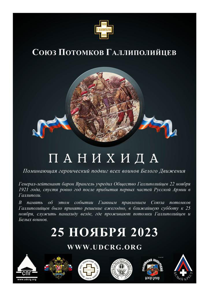 25 ноября 2023 года, в очередной раз, Союз Потомков Галлиполийцев призывает всех Вас присоединится к общей молитве о героях Белого Движения.