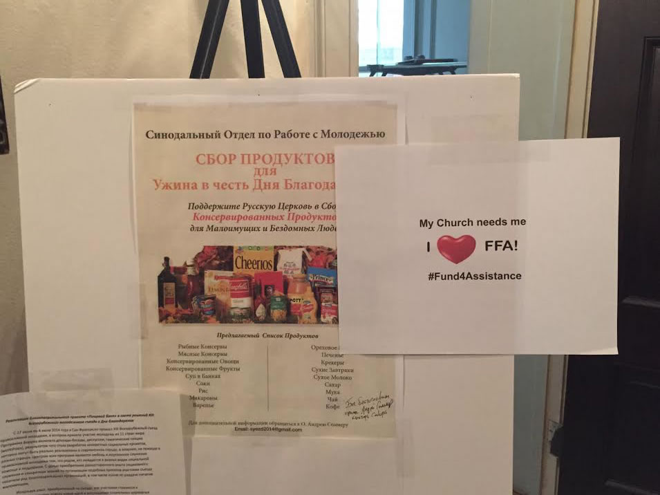 Воплощая в жизнь решения XIII Всезарубежного съезда, который прошел минувшим летом в Сан-Франциско, в преддверии Дня благодарения Синодальный молодежный отдел достиг договоренности с пищевым банком города собрать и передать туда баночные консервы для неимущих и бездомных жителей города Нью-Йорка. По благословению митрополита Восточно-Американского и Нью-Йоркского Илариона приходы Нью-Йоркского благочиния и присоединившаяся к ним молодежь Николаевского Патриаршего собора в течение октября – в начале ноября собирала продукты длительного пользования, которые будут розданы в День благодарения нуждающимся. К приходам Большого Нью-Йорка присоединились приходы Русской Зарубежной Церкви из Лос-Анджелеса. Координацию работы вел Синодальный молодежный отдел и настоятели приходов Нью-Йоркского благочиния.