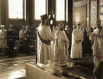 Еп. Марк предстоит за литургией в озноменование 1000 летнего юбилея в сослужении о. Николая и архид. Агапита. Слева впереди королевская семья