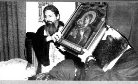 Иерусалимская икона, присланная с Афона вдовствующей имп. Марии Федоровне, начала мироточить в 1995 г. На фото о. Николай и иером. Алексей (Бирон). 1996 г. |