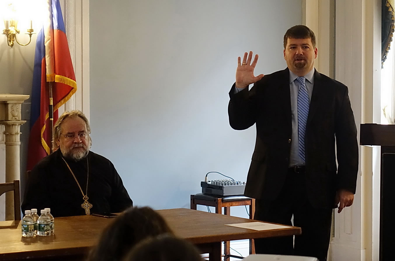 В субботу, 10 ноября, в здании Архиерейского Синода в Нью-Йорке, Молодежная ассоциация равноапостольного князя Владимира провела симпозиум, посвященный 100-летию мученической кончине Царственных страстотерпцев. С основным докладом на симпозиуме – «Монархия, модерн и мифология от Вавилона до Византии и до наших дней» - выступил профессор истории Hellenic college Николай Гансон.