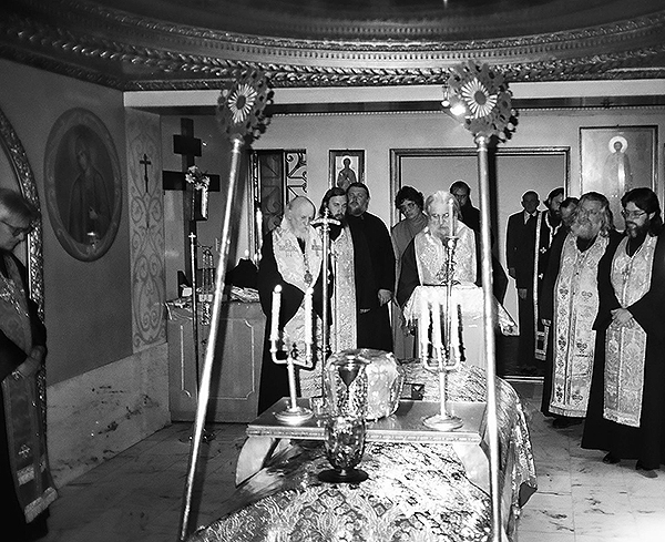 По окончании подготовительных работ после возгласа «Благословен Бог наш» и начальных молитв начали читать над гробницей Святое Евангелие от Иоанна: «В начале бе Слово…», и уже к девяти часам пополудни, во время чтения Святого Евангелия, прибыли во святую усыпальницу правящий Западной Американской епархией Владыка архиепископ Антоний, архиепископ Сиракузский и Троицкий Лавр (Шкурла), епископ Сеаттлийский Кирилл, протоиерей Стефан Павленко, протоиерей Петр Перекрестов, иерей Сергий Котар, иеромонах Петр (Лукьянов), иерей Павел Ивашевич и иеродиакон Андроник (Таратухин). Было всего 15 человек: три в архиерейском сане, семь в иерейском сане, три в диаконском сане, один чтец и один мирянин.