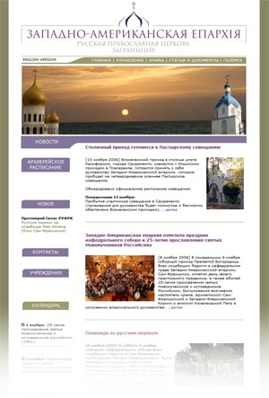 The official website of the Diocese of San Francisco and Western America, www.wadiocese.com, had not been updated since April 2006. The site was completely overhauled this fall, and beginning on November 1, has been updated regularly. The latest posts include photographs of the feast day celebrations of the Cathedral of the Mother of God "Joy of All Who Sorrow" and the celebration of the 25 th anniversary of the glorification of the Holy New Martyrs and Confessors of Russia; the pannikhida for the Russian sailors who died in 1863 and 1905 who are buried near San Francisco; an item on the new CDs of liturgical music; the schedule of archpastoral visits by His Eminence Archbishop Kyrill; and the forthcoming Pastoral Conference of the Diocese of San Francisco and Western America scheduled for November 13-16, etc.
