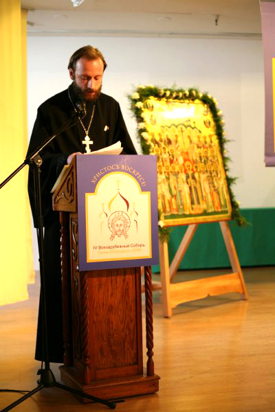The first speech, "The Spiritual-Historical Heritage of the Russian Church Abroad," was read by Protopriest Nicholas Karipoff, Rector of Protection Cathedral, Melbourne, Australia. Fr Nicholas said that from the very first day, ROCOR saw herself as the preserver of spirituality and of proper ecclesiastical life. The speaker is convinced that the ROCOR will bring benefit to Russia if she finds courage to speak honestly, not haughtily, without losing her repentant spirit. The speaker recalled that the founder of ROCOR, Blessed Metropolitan Anthony (Khrapovitsky), taught that Orthodoxy is first and foremost a religion of repentance. The legacy left by the bishops and clerical guides of ROCOR dictated that the proper order of Church life be preserved for the Russian Church, an order that could not be preserved in the Church in the Fatherland which was oppressed by her enemies. While the bishops abroad thought of themselves as sufferers for the Church of Russia, the Lord preserved the spirit of ROCOR unharmed. When the course of exclusivity, of self-satisfaction was later taken, the ROCOR began thereby to sin against the legacy of her founding fathers. "The repentant return onto the original path will not only help us, but the entire Russian church, to return to the sober and healthy life of the Church of Holy Russia, the Church of the Pan-Russian Council of 1917-1918, the Church of the Holy Martyrs," said Fr Nicholas.