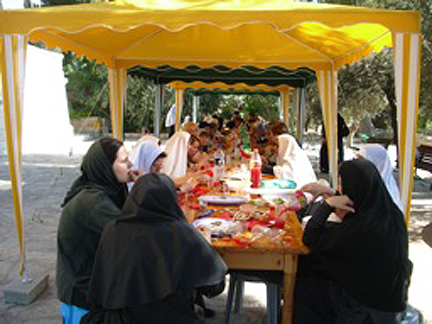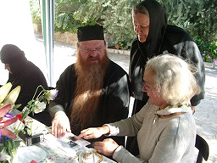 As usual, all the nuns participated in the preparations for the holiday. We approach the day striving to do as much as possible. For example, this year, our main contribution towards the main convent holiday was the publication of a book titled "Gethsemane Convent," by Galina Meyerthal of Berlin. Galina has been coming to the Holy Land for 18 years now, of which she has spent 10 gathering materials on the history of Gethsemane. We have been waiting a long time for this book. And now with God's help, we received copies of it during the feast day celebrations. These books, printed in a Jerusalem print shop, arrived during all-night vigil. By the next day, we already had them on display. All the nuns received a copy as a gift, so that in studying our historical past, they could learn from those whom we were not fated to meet in person, but whose example would inspire us towards new podvigi for the sake of Christ, for the founders of the Convent were real nuns of high spiritual calling. The book recounts the history of the church and of Empress Maria Alexandrovna, in whose memory this great royal church was built. It contains many valuable photographs and recollections of the Convent's residents. There are also descriptions of all the holy items of Gethsemane. The book is very useful, edifying and timely. All the nuns were happy to receive a copy of the book. Galina Meyerthal has spent time living in Gethsemane itself while making the final preparations for the book's publication. We all helped her. And now this long-awaited moment has arrived. The trapeza was held, as usual, in the courtyard before the church itself. Sitting at a long table under a tent, we celebrated three events—the church's feast day; the namesday of the Convent's Prioress, Mother Magdalena, its senior resident; and the publication of the book.