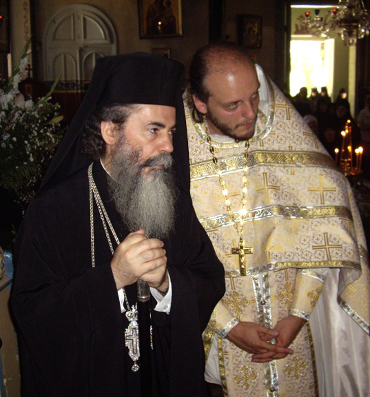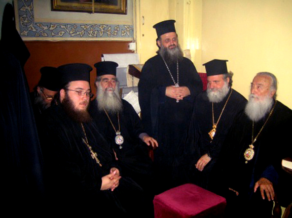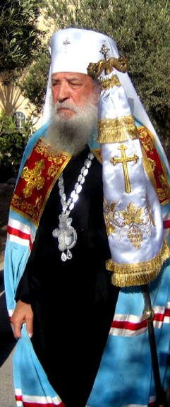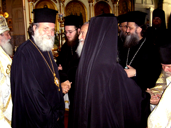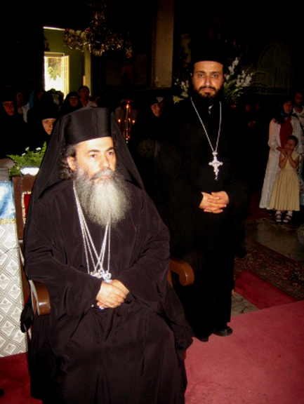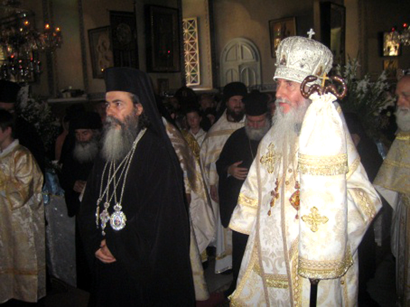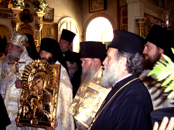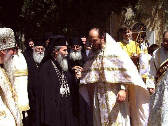 "Your Eminence, Eminent Vladyko! Your Eminence, dear in the Lord fathers, brothers and sisters! Today the grace of the Holy Spirit has gathered us to lift our prayers of gratitude to God, who granted us His great mercies. We rejoice in greeting you on this day of celebration. During a recent meeting with His Eminence Vladyka and the members of the delegation of the Russian Orthodox Church Outside of Russia, we heard about the progress of discussions between both parts of the Russian Orthodox Church. On behalf of our Holy Synod and the Brotherhood of the Holy Sepulchre, I wish to express our joy that the division in the Russian Church is being overcome, which resulted from the sin of man. We hope that communion and unity are restored in the near future. The fact that such a large contingent of our Holy Church is in attendance today attests to our support for this great and holy work, to our readiness to help in whatever way possible in the manifestation of the unity everyone desires. We also hope that other Orthodox Christians follow the example of the Russian people and begin to overcome their divisions and quarrels within their own Churches. Once again I congratulate you all and as a symbol of our love to the monastics of this holy convent, I ask that you accept this icon of the Theotokos, which was painted in Russia. May She preserve all of you and grant you the peace of Christ."