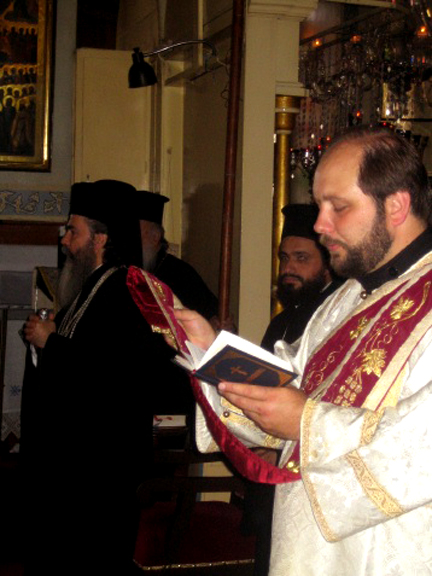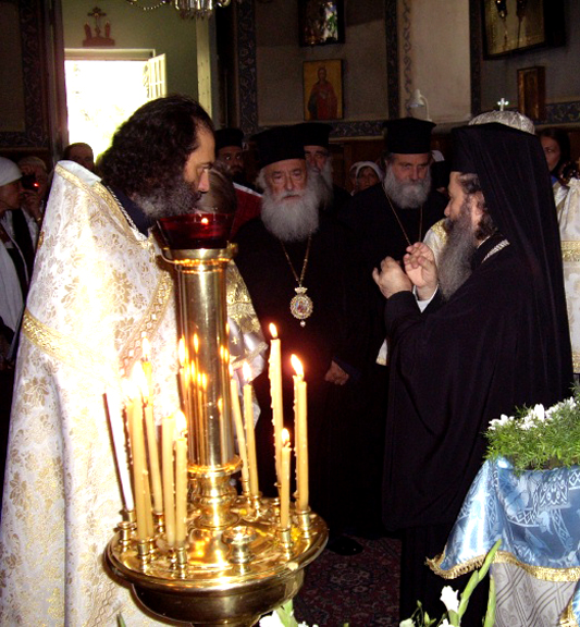 "On this important and holy day, I extend my heartfelt greeting to His Holiness Patriarch Theophilos, who prayed with us today, and on behalf of our Russian Ecclesiastical Mission in Jerusalem I wish to express to you, Holy Vladyka, profound gratitude for your paternal care for our monastics and clergymen who labor in these holy monasteries. I also thank the members of the Holy Synod of the 'Mother Church' and the Brotherhood of the Holy Sepulchre and wish them spiritual peace and joy in their service to our Chief Pastor, Christ. I am also happy to greet the Overseer of our Mission, His Eminence Archbishop Mark, the Very Reverend Abbess Moisseia and the nuns of this convent and all our clergymen, headed by Hegumen Andronik.