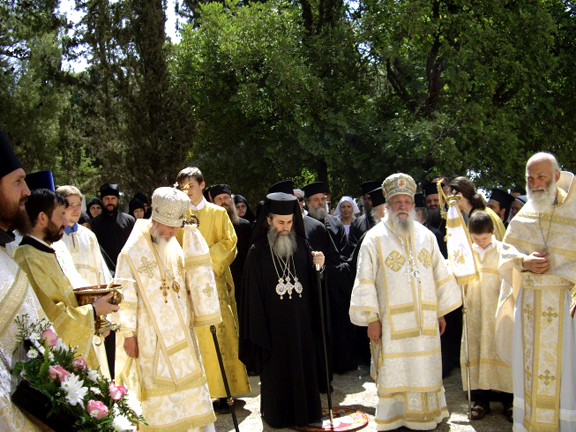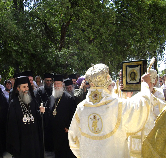 Metropolitan Laurus Officiates at Divine Liturgy on the 100 th Anniversary of the Ascension Convent on the Mount of Olives On August 29, the Translation of the Image of Christ "Not Made by Hands," called the "Third Savior Icon" by many Russians, His Eminence Metropolitan Laurus officiated at the celebrations of the 100 th anniversary of Ascension Convent on the Mount of Olives, Jerusalem. The celebrations began with Divine Liturgy, conducted by Metropolitan Laurus along with His Eminence Archbishop Mark of Berlin and Germany; Hegumen Andronik (Kotliaroff); Priest Serafim Gan; Hieromonk Savva; Hieromonk Nicholas (Perekrestov); Hieromonk John; Priest Peter Sturm; Protodeacon Victor Lochmatov; Deacon Nicholas Olhovsky and Hierodeacon Cyprian (Alexandrou). His Holiness Patriarch Theophilos of Jerusalem and All Palestine arrived for the end of Liturgy along with the members of the Synod of Bishops of the Jerusalem Patriarchate and the Brotherhood of the Holy Sepulchre, who conduct their monastic labors at the Life-bearing Tomb of Christ. His Holiness was greeted by the clergymen as the Convent choir, under the direction of Nun Vassa (Larin), sang "Ton despotin."
