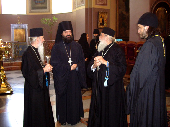 Greeting His Eminence, Fr Elisey called the visit to Holy Trinity Cathedral a symbol of the inner unity of the children of both parts of the Russian Orthodox Church and expressed joy that the Head of the Russian Orthodox Church Outside of Russia prayed at the holy places of this Cathedral on this holiday, which, he hoped would lead Russian Orthodox Christians to full prayerful and Eucharistic unity. In his response, His Eminence thanked the Head of the Mission of the Moscow Patriarchate for the invitation and wished him Divine help in his service. Then the visitors proceeded to the Mission's headquarters, where Fr Elisey offered a luncheon in honor of the First Hierarch of the Russian Orthodox Church Outside of Russia and the individuals accompanying him. Archimandrite Elisey then told His Eminence Metropolitan Laurus, His Eminence Archbishop Mark and the other visitors about the joys and difficulties of the Mission of the Moscow Patriarchate in the Holy Land.