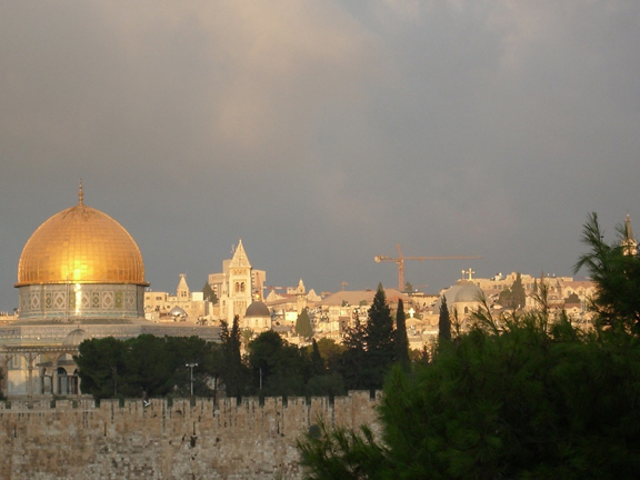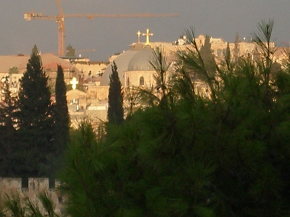 The Cross Over "Russian Excavations" is Consecrated It is morning in the Holy Land. The sun rises over the Moab Mountains and Jerusalem is transformed into a golden city. There exists no more beautiful sight than the first moments of dawn in the Holy City of the Resurrection, especially when dark clouds still hurry across the sky. One stands in awe and praises God. Against the backdrop of this golden city, a large Orthodox cross above the Church of St Alexander, (known as the "Russian Excavations," the property of the Orthodox Palestine Society) suddenly shines forth like a morning star. The cross is clearly seen from the Mount of Olives, and from Gethsemane. A few days ago, on the feast day of St Alexander, its gilding completed, it was ceremoniously blessed. This was an historic, important event. This cross stands in the very heart of Jerusalem, near the Church of the Resurrection of Christ. The "eight-pointed" bronze, gilded cross stands three meters tall and adorns the Holy City as a symbol of Russian Orthodoxy in the Holy Land. Hieromonk Nicholas (Perekrestov), Secretary of the Russian Ecclesiastical Mission in Jerusalem, was given the honor of performing the rite of consecration. Reading the proper psalms with trembling, we utter the words: "Let us enter God's dwelling; let us worship at God's footstool," and "Exalt the Lord our God and worship at His holy mountain." As we stand on the roof of the church, to the left is the dome of the Sepulcher of the Lord, Golgotha nearby, and underneath us is the Judgment Gate, through which Christ was led to the "Place of Skulls."