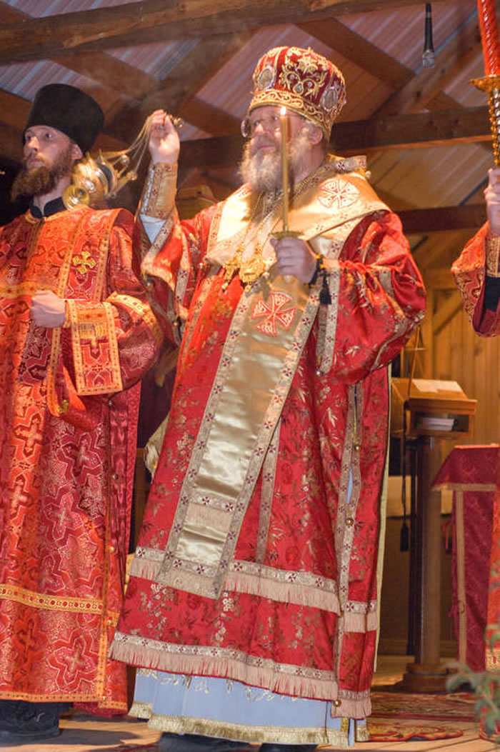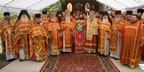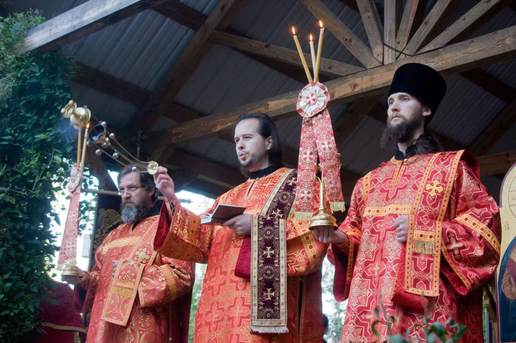 The festal Divine Liturgy was held the next day under the open sky. During the reading of the hours, Reader Jonathan Yerkes of St Nicholas Parish in Millville, NJ, was ordained subdeacon; and the local parishioner Jeremiah Davis was ordained a reader. During the minor entrance, the rector of the podvorie, Hieromonk Seraphim was awarded the gold pectoral cross and elevated to the rank of hegumen; Hieromonk Alexander was awarded the nabedrennik. At the prescribed moment of the Liturgy, Subdeacon Jonathan was then ordained to the deaconate.
