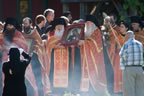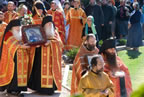 A procession of the cross was first made from the monastery church to the open-air chapel of the Icon of the Mother of God of the “Sign” with the Life-bearing Cross, the myrrh-streaming Icon of St Anne and relics of Holy Great Martyr Panteleimon. After the procession, a moleben was performed at the chapel before the Port Arthur Icon of the Mother of God.