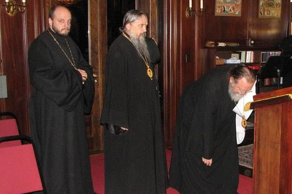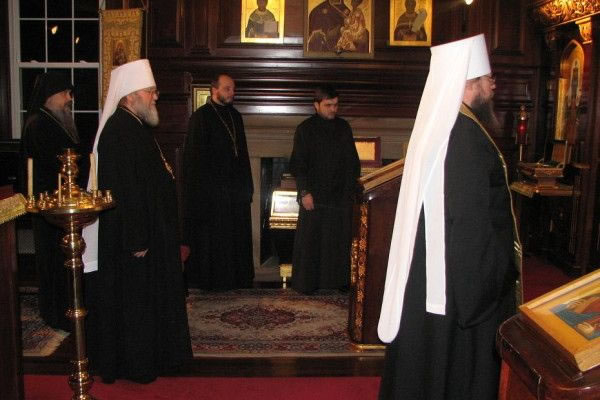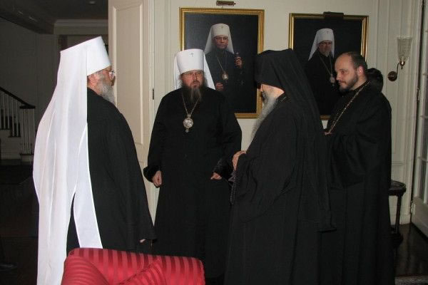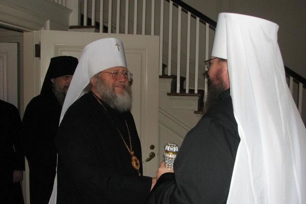 On Tuesday, December 2, 2008, the Primate of the Russian Orthodox Church Outside of Russia visited the residence of His Beatitude Metropolitan Jonah and congratulated him on his election as head of the Orthodox Church in America. Giving His Beatitude an icon of St Nicholas the Miracle-worker, His Eminence Metropolitan Hilarion expressed the hope that the prayers and omophorion of the great hierarch always accompany him in his travels, in his service and difficult archpastoral labors. Metropolitan Jonah then performed a moleben to St John of Shanghai and San Francisco at the chapel, after which the hierarchs shared a trapeza luncheon. Also at the meeting, held in the spirit of Christ’s love and mutual understanding, were His Grace Bishop John of Caracas; Protopriest Alexander Garklavs, Administrator of the Chancery of the Orthodox Church in America; Protopriest Serafim Gan, Chancellor of the Synod of Bishops and Secretary of the First Hierarch of the Church Abroad; and Reader Dionisii Lvov.
