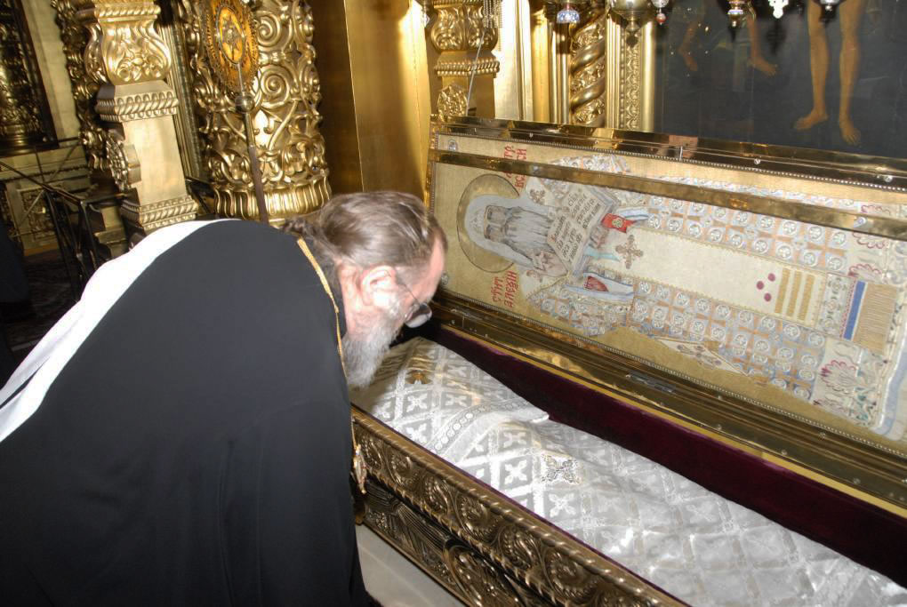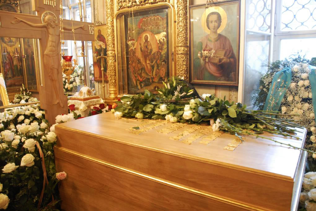 During his final day in Moscow, His Eminence Metropolitan Hilarion went to Epiphany Cathedral, where he presented a wreath on behalf of the Russian Orthodox Church Outside of Russia and performed a litia over the coffin of His Holiness Patriarch Alexy.